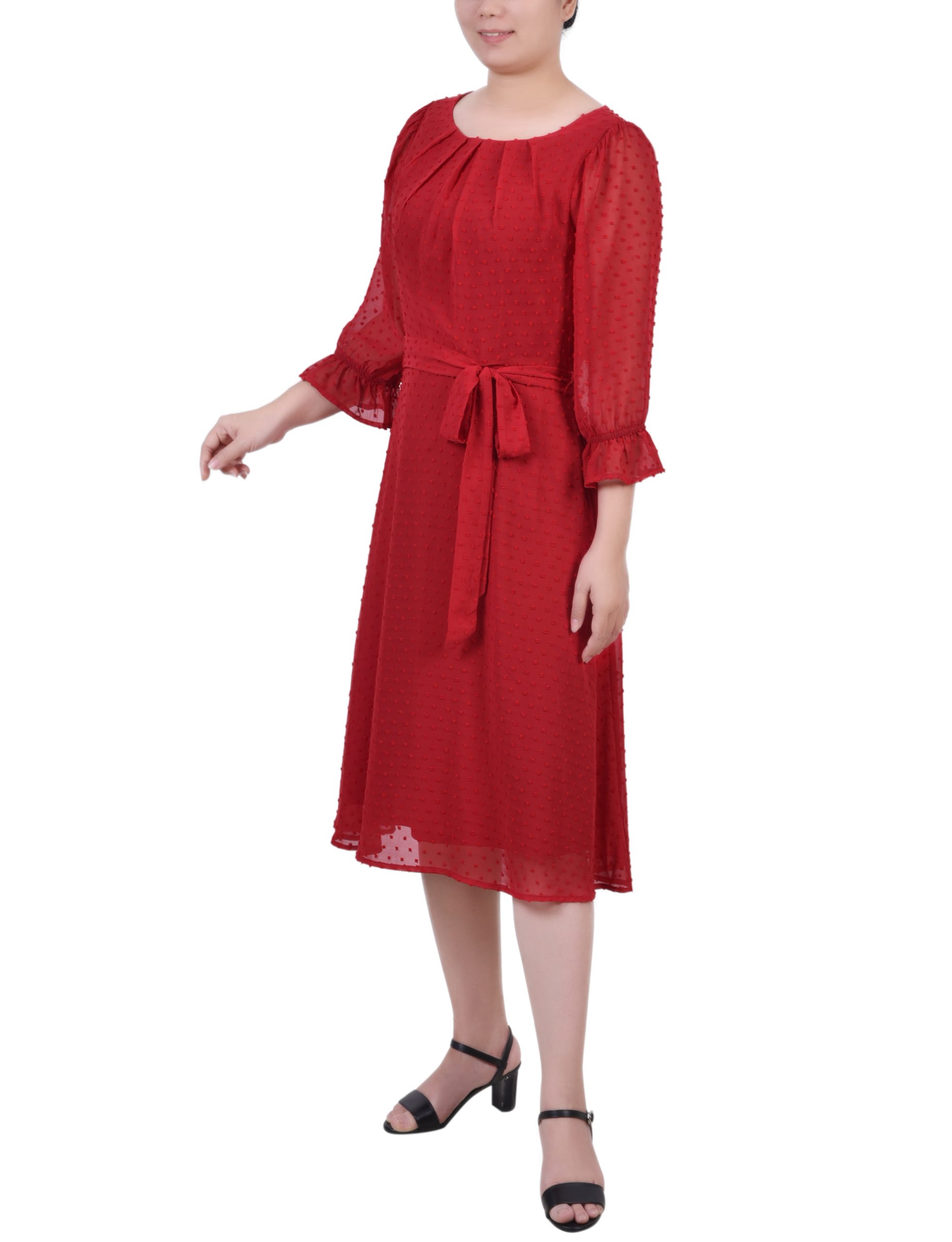 3/4 Sleeve Belted Swiss Dot Dress