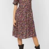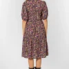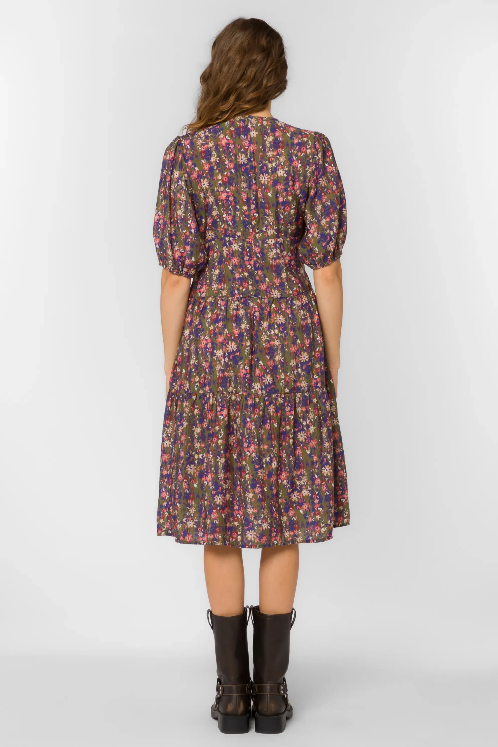 Short puff sleeve, V-neck pop over tiered midi dress, zip back closure, side seam pockets