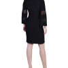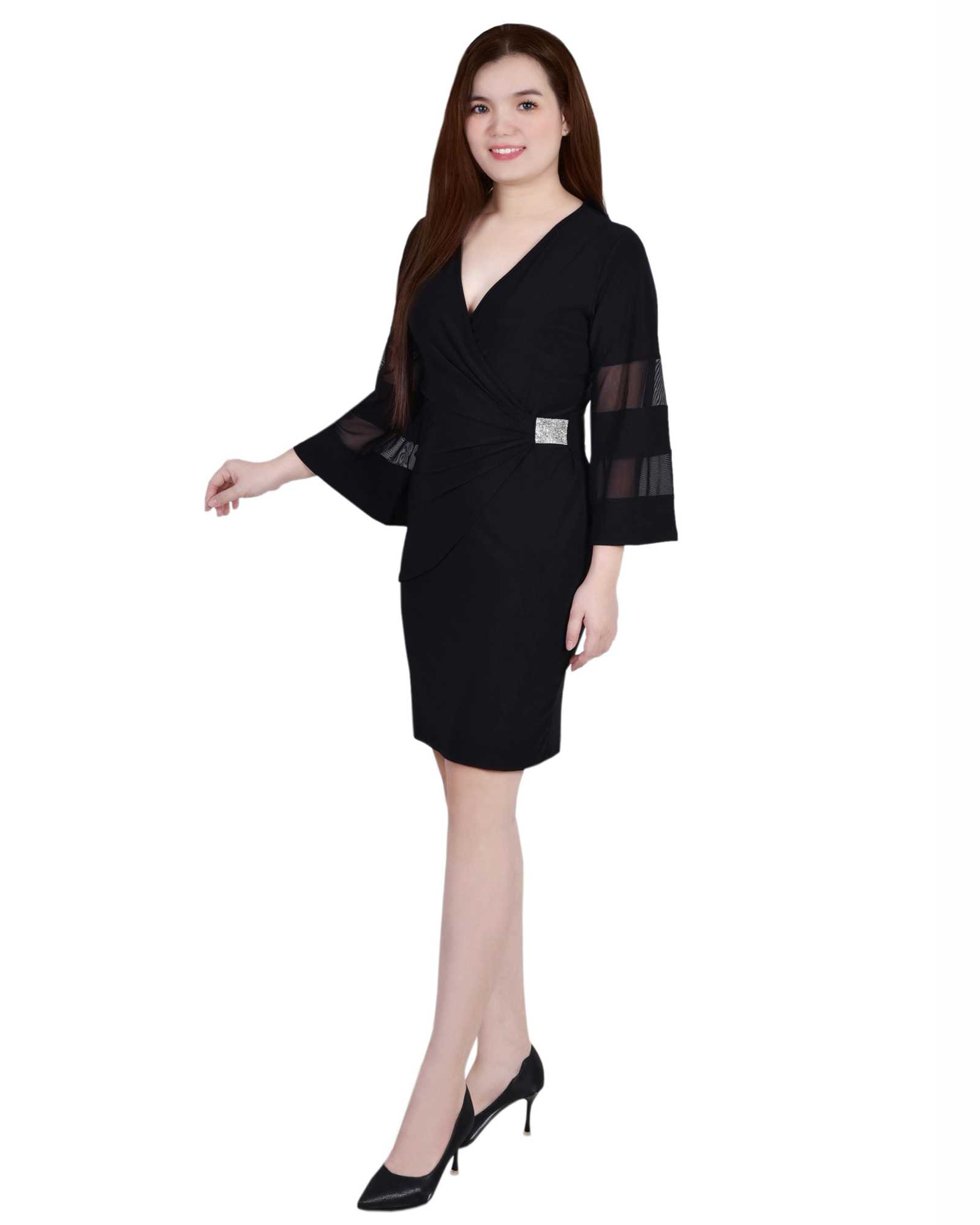 Party it up in this faux wrap dress from NY Collection featuring a stone buckle and mesh sleeve insets.