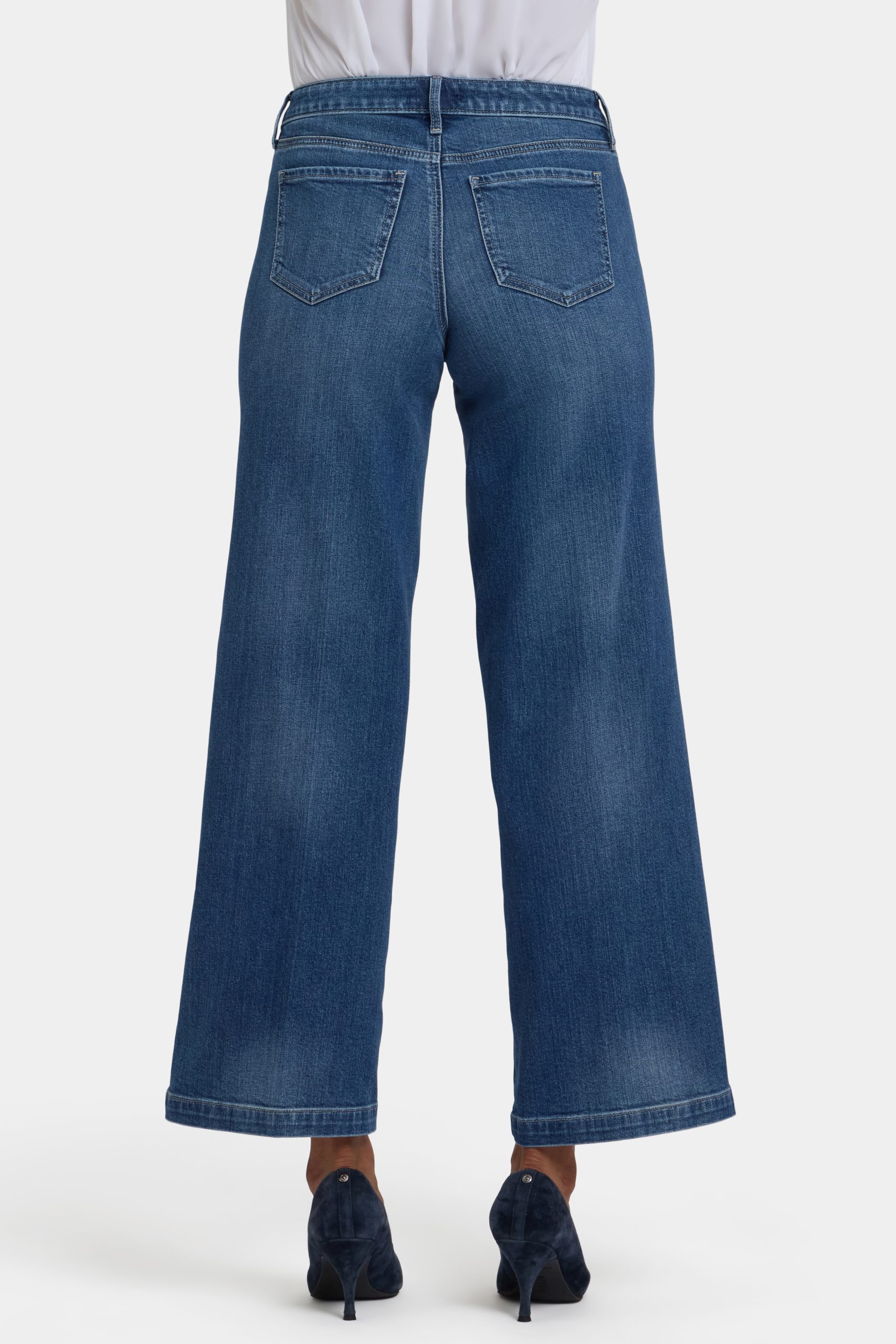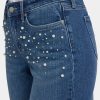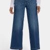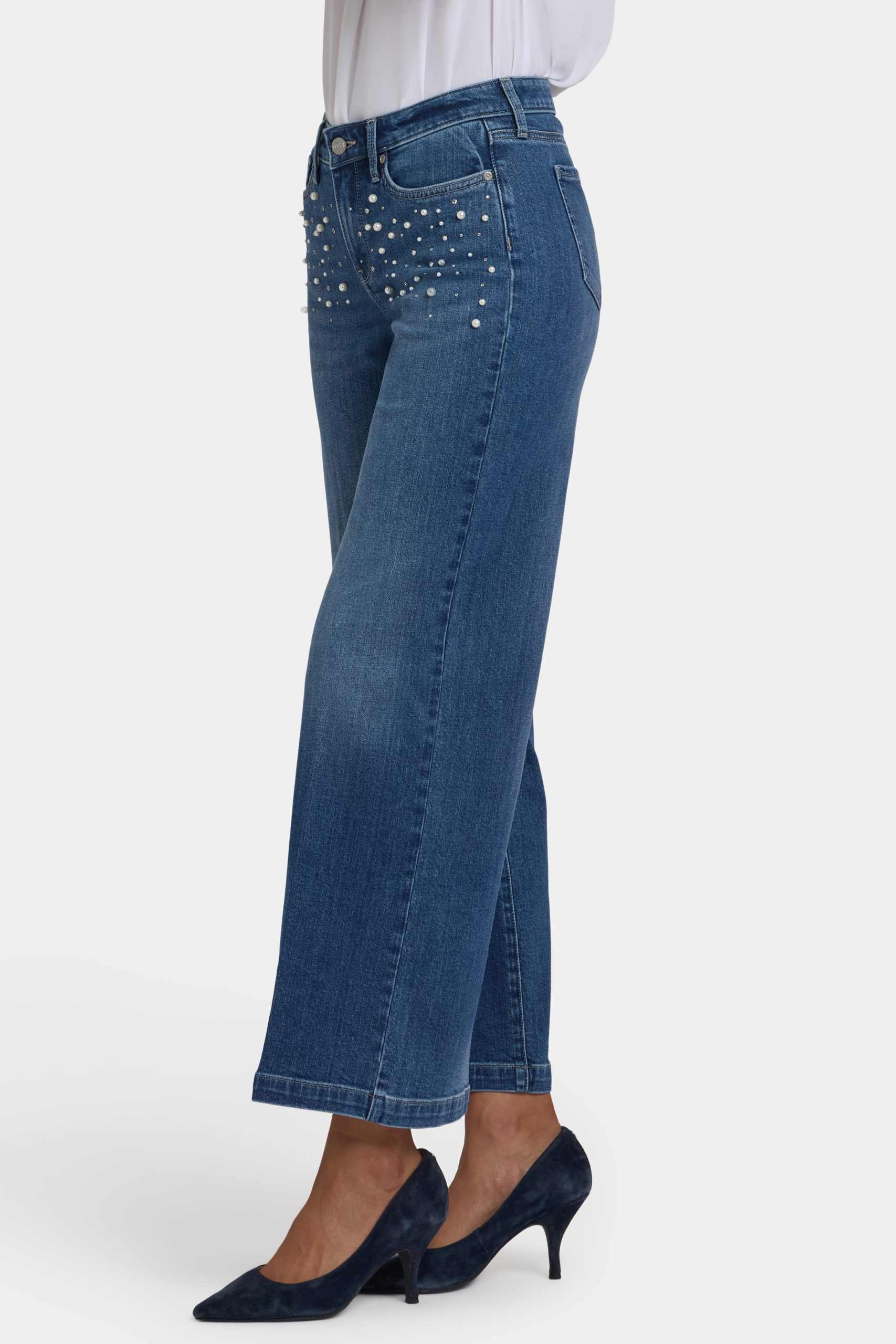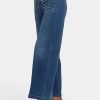 The Teresa Wide Leg Jeans by NYDJ cinch your waist, enhancing your natural silhouette, while their wide legs add instant polish to everything you pair them with. This Teresa Wide Leg style features faux pearl and rhinestone embellishment on the front hips that gives it a glam look. Our Lift Tuck® Technology shapes and sculpts using a proprietary slimming panel with a patented criss-cross design. Finished with five-pocket styling and a zip fly with button closure. This jean is made with earth-friendly methods that result in reduced consumption of water, chemicals and/or energy.