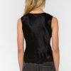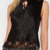 Sleeveless textured satin tank, tie front detail, lace trim hem
