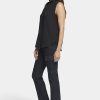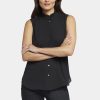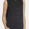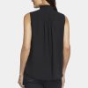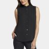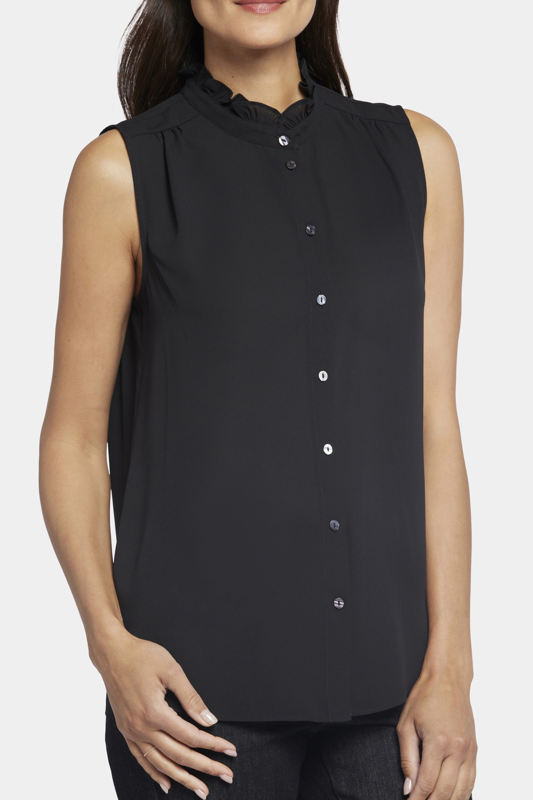 Your essential sleeveless blouse with a romantic twist. The Sleeveless Ruffle Neck Blouse by NYDJ makes any outfit more feminine with a ruffle-trimmed high collar and pintucked shoulders. This pretty style buttons up the front, and the sleeveless design makes it perfect for warm weather or layering under jackets and cardigans. This blouse’s fabric is made with a sustainable polyester fiber created from 100% post-consumer plastic waste, resulting in less water and energy use and fewer greenhouse gas emissions without changing the look and feel of the fabric. The buttons are made with 50% post-consumer recycled polyester.