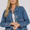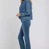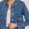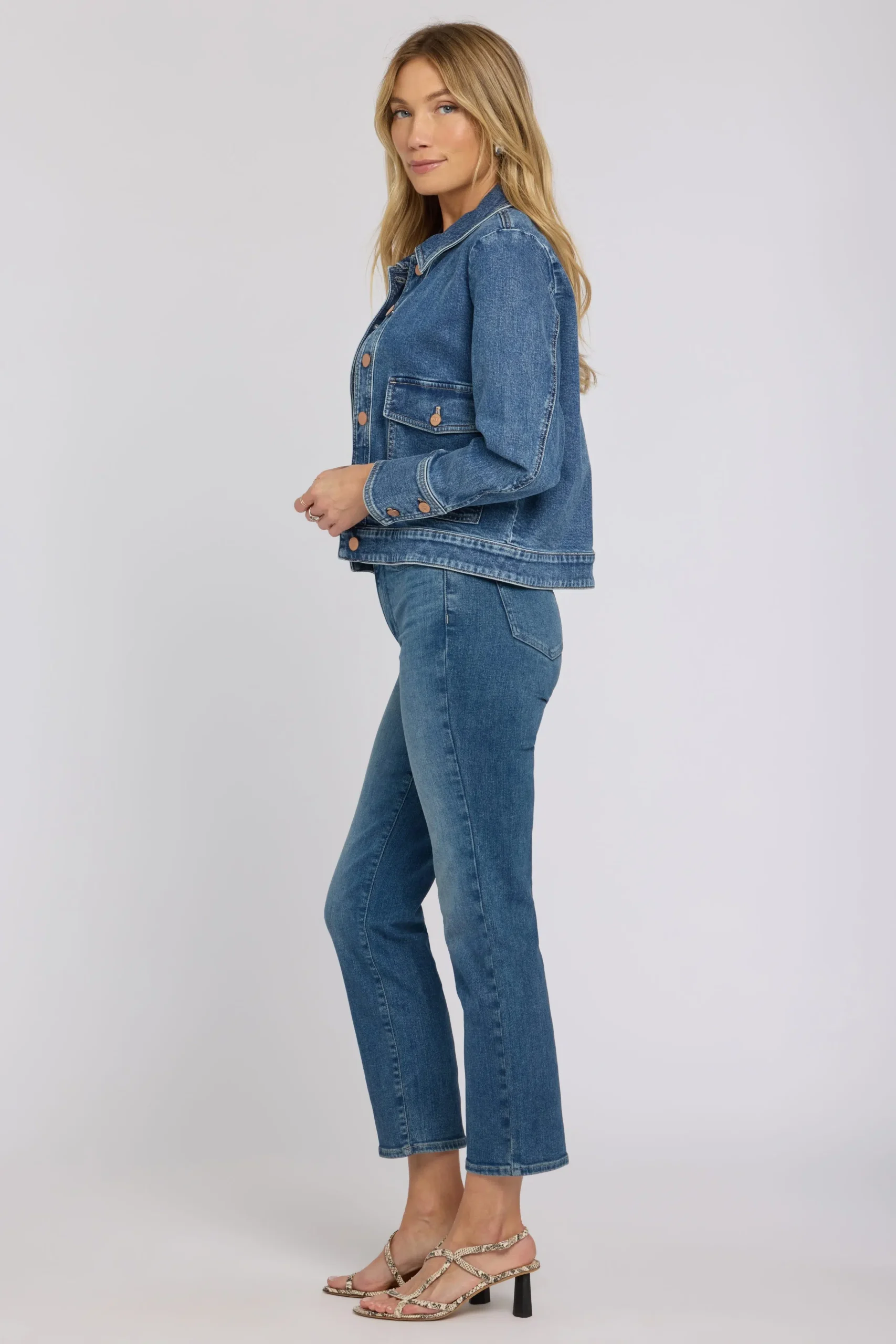 Layer on modern utility style with NYDJ’s Denim Jacket with Oversize Pockets. Created from premium denim, this versatile casual jacket features a point collar and bold button-flap pockets in the front. Finished with front button closures and button cuffs.