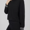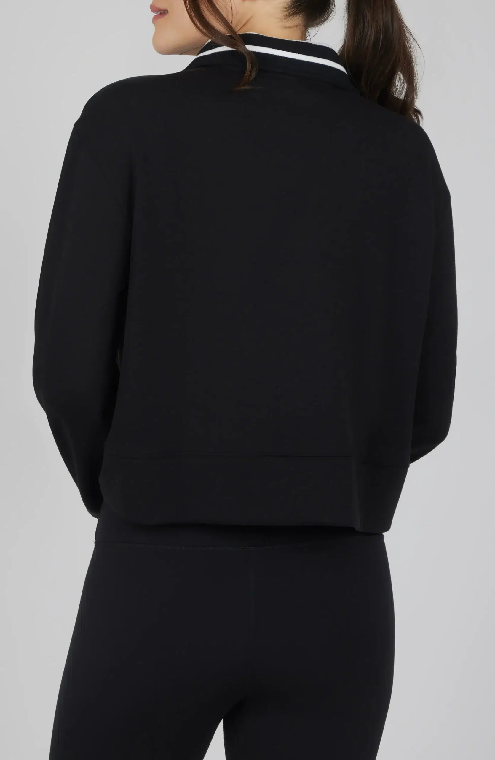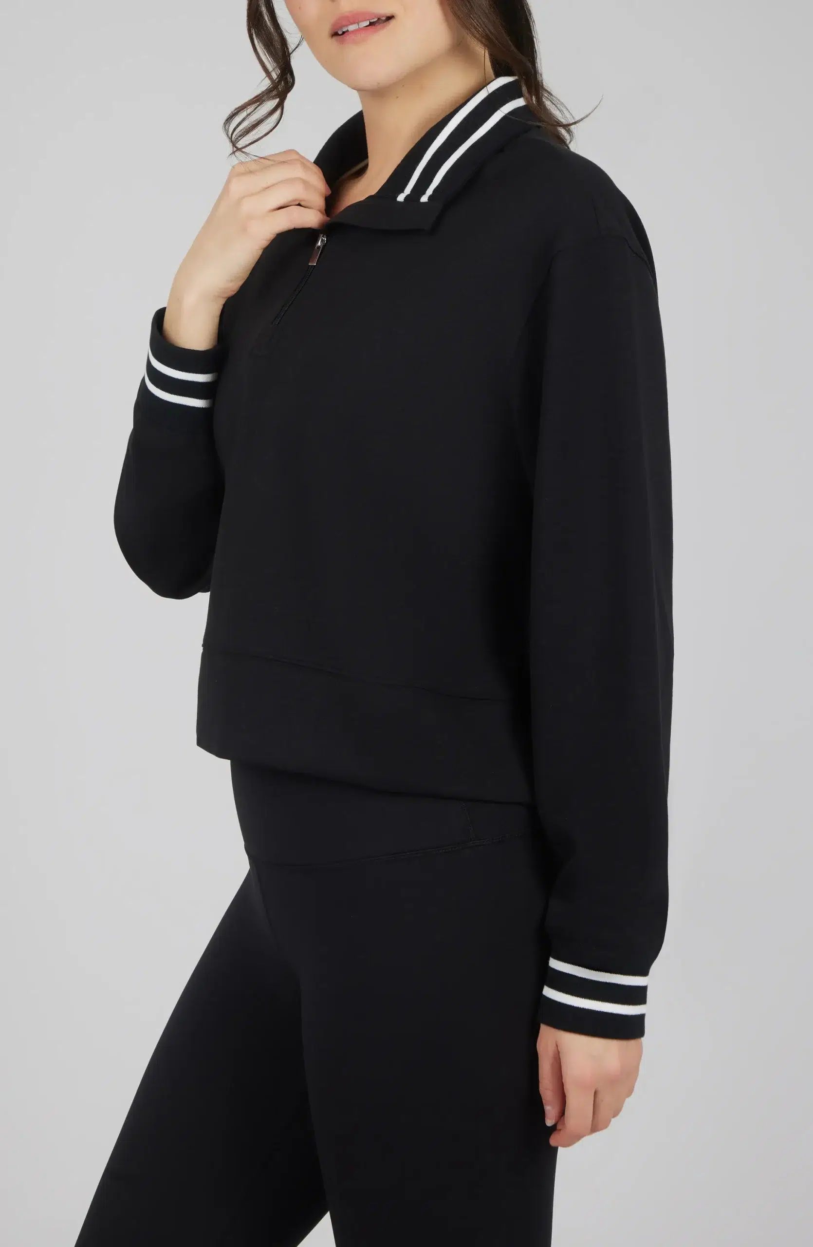Stay cozy in this half-zip pullover constructed from a soft, stretchy scuba knit and framed by striped trim for preppy style.